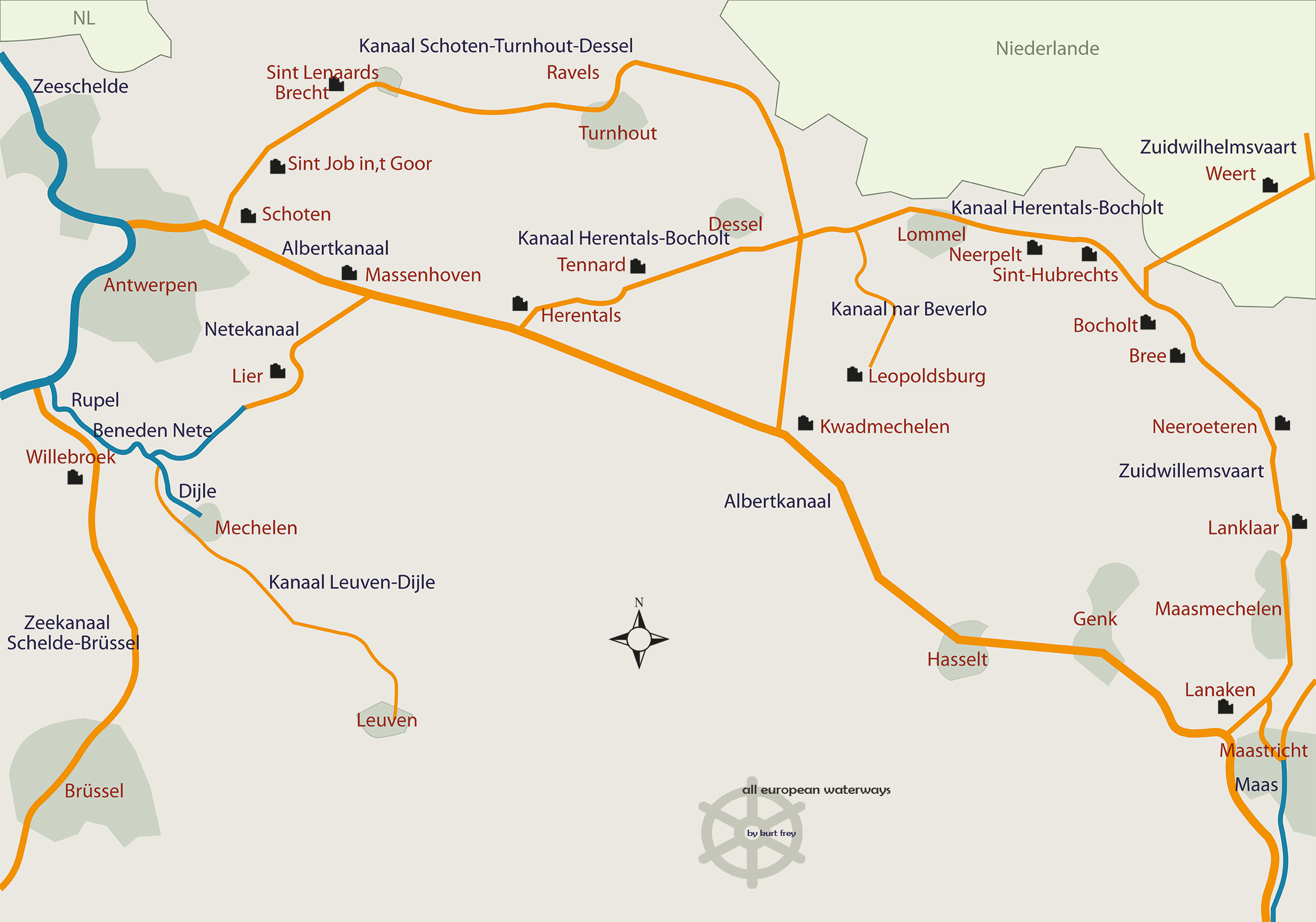 Bei Herentals verabschiedet sich unser Kanal vom Albertkanal nach Nordosten, Richtung Niederlande, wendet sich aber bei Lommel wieder gegen Südosten und geht bei Bocholt in die Zuidwillemsvaart über, welche dann bei Maastricht wieder zum Albertkanaal zurückkehrt.